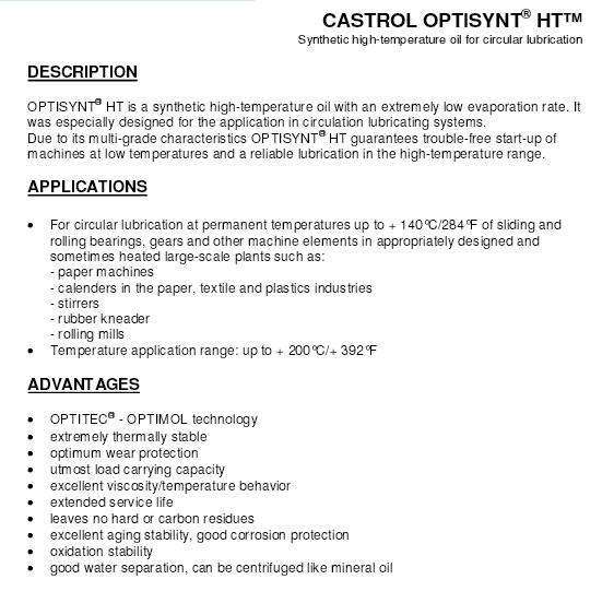 嘉實多Optisynt HT 合成高溫油率非常低的蒸發。 特別是在循環潤滑油被開發利用。 optisynt HT 100由于其通用的硬件性能,確保運行平穩,在低溫下,以及其在高溫下繼續運作。