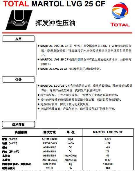 1.      MARTOL LVG 25 CF是一種快干性金屬成型加工油,它含有特殊的添加劑,摩擦系數極低。特別適用于沖壓熱轉換器或空調系統的鋁質散熱片