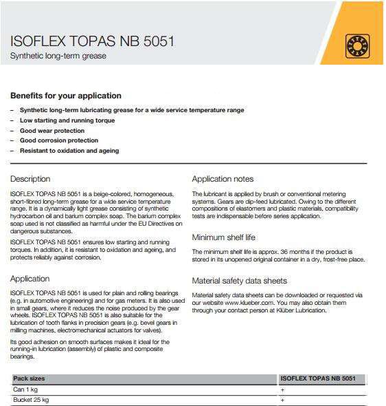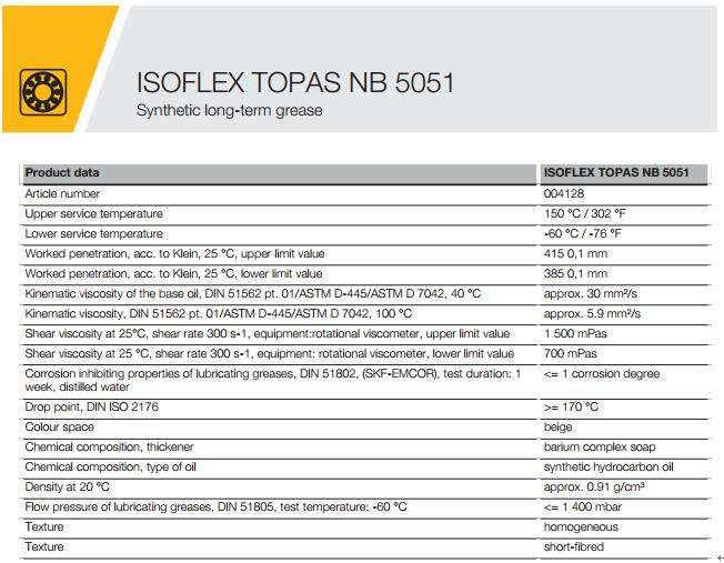 ISOFLEX TOPAS NB 5051是米色的,均勻的,短纖維的長期潤滑脂寬工作溫度
