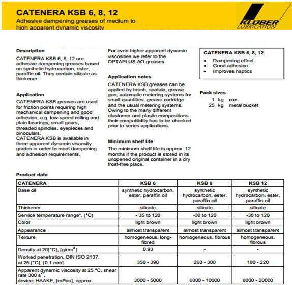 CATENERA KSB脂肪的附著力和阻尼脂。 脂肪包括混合的油與合成的烴,酯和石蠟油。 的一致性因子使用硅酸鹽。