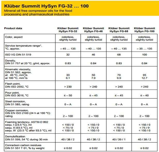Kluber Summit HySyn FG油空氣壓縮機油的基礎上合成烴。 這些油與礦物油和其它的合成烴油混合。
