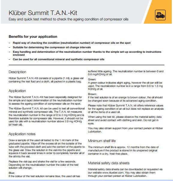 Kluber Summit TAN-Kit包括吸移管(1毫升),與試驗液和清潔布的玻璃安瓿。 一切都裝在一個塑料袋。