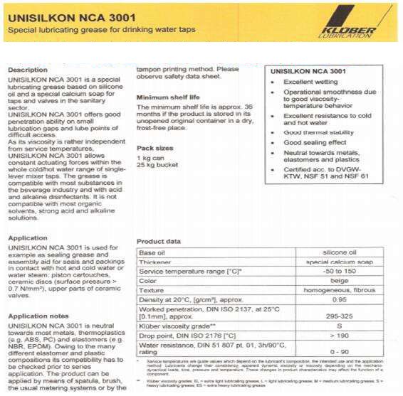克魯勃UNISILKON NCA 3001 UNISILKON NCA 3001是一種特殊的潤滑油脂基于硅橡膠,石油和一種特殊的鈣基稠化劑。運用在衛浴水龍頭和閥門之多。UNISILKON NCA 3001提供很好的滲透能力可以在小潤滑間隙及潤滑點上良好表現。可用作密封油脂和填充的援助。在接觸到熱水和冷水或水蒸活塞,陶瓷閥瓣(表面壓力>0.7毫米2N /部分)。
