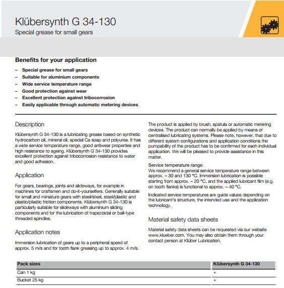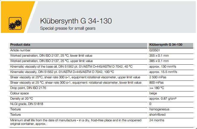 克魯勃G 34-130小齒輪專用潤(rùn)滑脂的基礎(chǔ)上的合成烴油,礦物油與一種特殊的鈣皂和聚脲作為一致性。 其特征在于該產(chǎn)品是很寬的溫度范圍,良好的抗磨損性能和高耐老化。 ,克魯勃G34-130提供良好的保護(hù)對(duì)磨損腐蝕,具有良好的附著力和耐水性高。