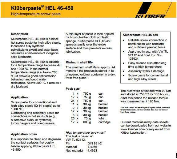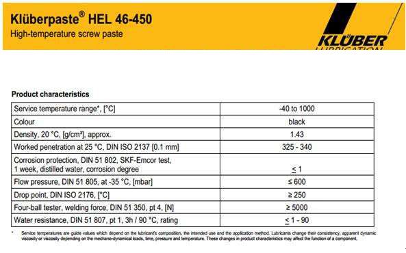 KLüberpaste HEL 46-450是黑熱的螺釘膏高合金鋼。它包含全合成聚亞烷基二醇酯基礎(chǔ)油和無機(jī)固體潤滑劑組合。