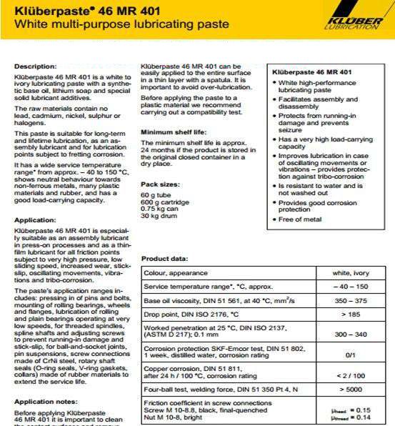 KLüberpaste 46 MR 401是一種多用途潤滑膏選擇基礎油,鋰皂和特殊的固體潤滑劑添加劑。便于組裝和拆卸的高負荷,積極連接