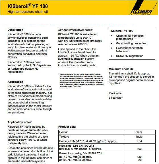 克魯勃YF 100是一種含有聚亞烷基高溫鏈條油的固體潤滑劑。 它的特點是良好的潤濕性的能力,良好的和高穩定。