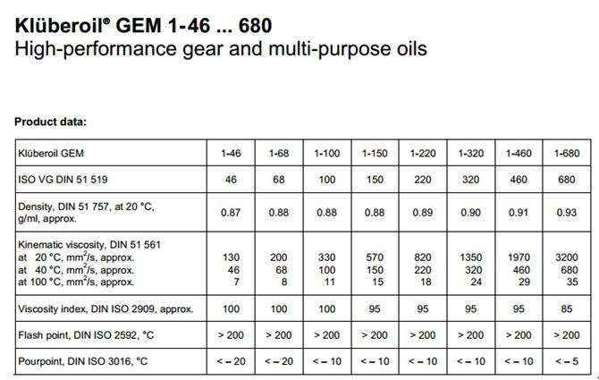 克魯勃GEM 1 油提供了一個的膠合承載高,從ISO VG 150 API GL-4。 變速箱也非常高的峰值載荷,振動和振蕩的充分保護,防止劃傷。