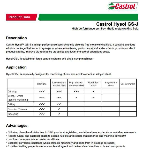 嘉實多Hysol gs-j適合于鑄鐵及低中合金鋼的加工。適合于包括車削、銑削、鉆孔..