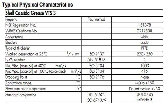 蒸汽及消毒劑等溶液的性能.完 全滿足食品行業的嚴苛要求。 殼牌加適脂VTS在NSF注冊為H1類,用于存在可能發生偶然食品接觸的場合。