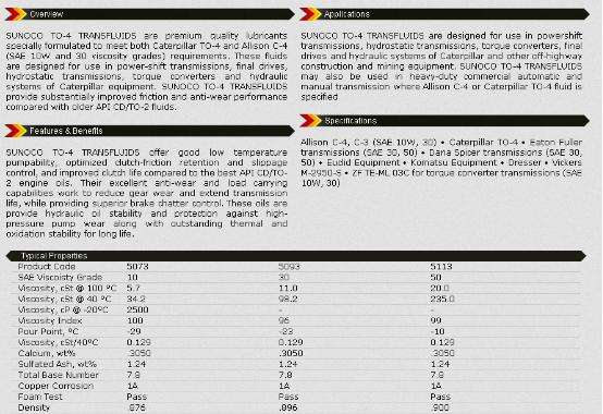 SUNOCO TO-4 TRANSFLUIDS設(shè)計用于動力換檔變速箱、液壓傳動、液力變矩器、終傳動和液壓系統(tǒng)的卡特彼勒和其他非公路建設(shè)和采礦設(shè)備。SUNOCO TO-4 TRANSFLUIDS也可用于重型商用自動和手動變速器在埃里森C-4或指定卡特彼勒- 4流體