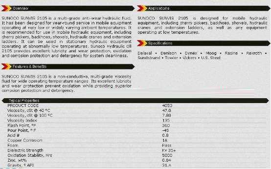 SUNOCO SUNVIS 2105是專為移動液壓設(shè)備,包括櫻桃采摘、挖掘機、鏟、液壓起重機和伸縮梯,以及任何在較低的溫度下操作設(shè)備。