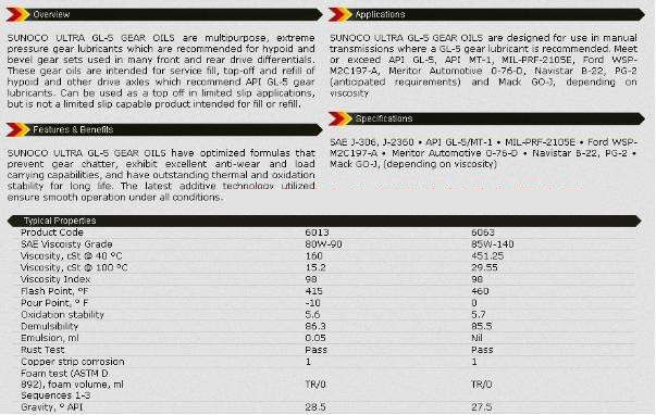 SUNOCO ULTRA GL-5 齒輪油是專為使用手動變速箱,GL-5齒輪潤滑油推薦。達到或超過API GL-5,API MT-1,MIL-PRF-2105E,福特wsp-m2c197-a,美馳汽車0-76-d,納威司達b-22,PG-2(預期的要求)和麥克GO-J,取決于粘度