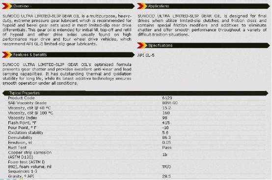 SUNOCO ULTRA LIMITED-SLIP 齒輪油是專為最終利用有限的滑動離合器和摩擦片和摩擦改性劑和含有特殊添加劑消除顫振和提供平滑的性能在各種困難的牽引下。