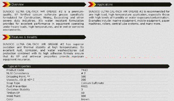 SUNOCO ULTRA CAL-TACK WR GREASE 2具有優異的氧化穩定性和熱穩定性,在高溫下。其優良的防銹、耐腐蝕、水沖洗/噴霧保護結合其高附著力配方確保其極壓抗磨性能提供設備保險最大。