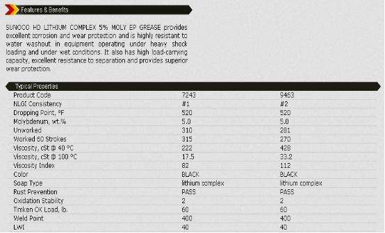 SUNOCO HD LITHIUM COMPLEX 5% MOLY E潤滑脂提供優良的耐腐蝕和磨損保護,是設備在重沖擊負荷和潮濕條件下的操作很強的抗水淋。它還具有高的承載能力,優異的抗分離能力,并提供優越的耐磨保護。