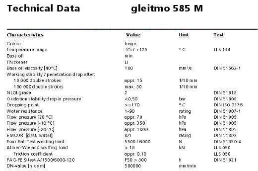 Gleitmo 585 M是一種高檔鋰皂潤滑脂基于礦物油。它包含了一個協同組合的白色固體潤滑劑,緩沖沖擊負荷,減少磨損。Gleitmo 585 M有助于防止微動腐蝕和允許較長的潤滑間隔。
