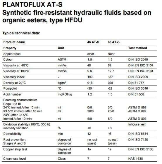 PLANTOFLUX AT/68 - S是耐火,HFDU類型環保降解抗燃液壓油,根據DIN 51 502和ISO 6743無礦物油和水。
