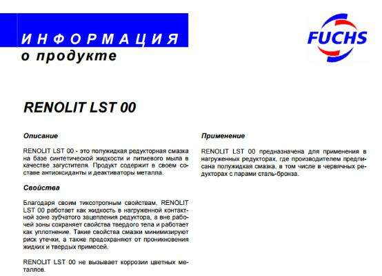 RENOLIT LST 00 - 半流體齒輪潤滑脂,合成油和鋰皂為稠化劑。 產品中含有抗氧化劑,其組成和金屬消磁。