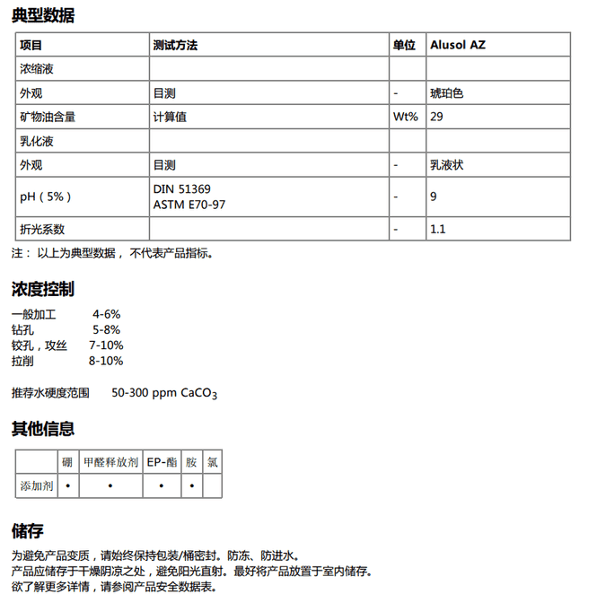 嘉實多 Alusol  AZ 是一款高性能、不含氯的半合成切削液。該產品特有的添加劑組合特別適用于各種類型的鋁合金加工, 同時有助于客戶提高加工性能、改善表面處理效果、實現出色的產品穩定性、提高生物穩定性并進一步降低整體運營成本。