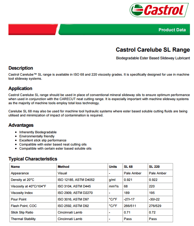 嘉實多Carelube SL系列是可生物降解酯基導軌油,包含ISO 68和220粘度等級。是專門為滑軌機械工具機床導軌系統使用。