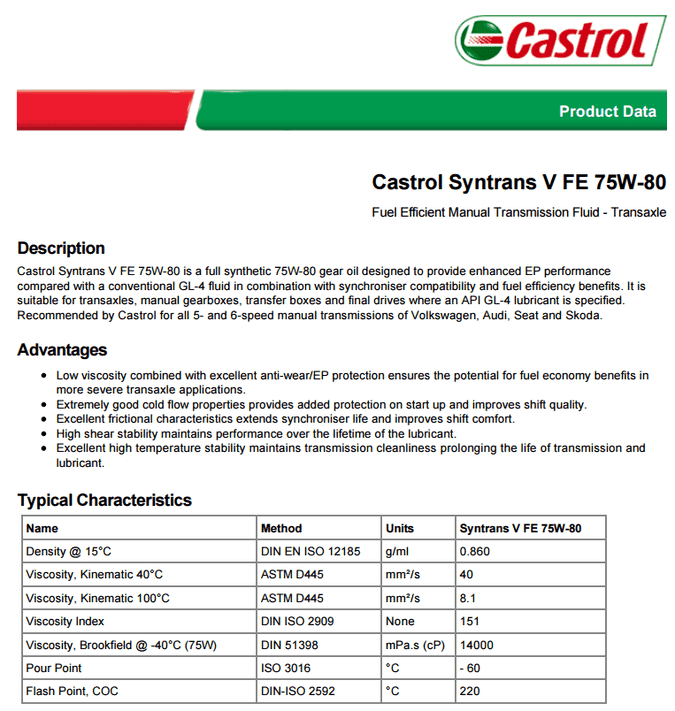 Castrol Syntrans V FE 75W-80是全合成齒輪油75w-80設計提供增強的極壓性能