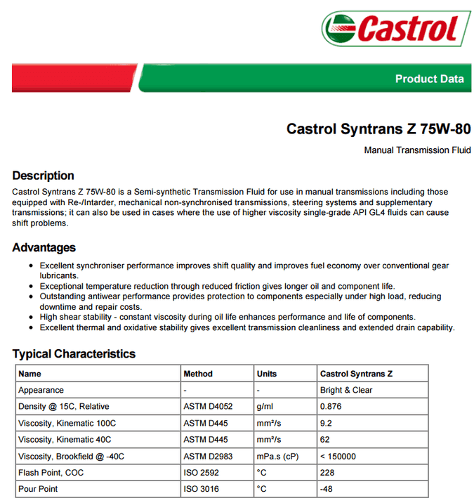 Castrol Syntrans Z 75W-80是用于手動(dòng)變速器,包括半合成傳動(dòng)液