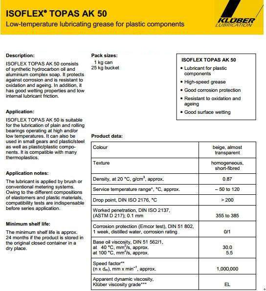 ISOFLEX TOPAS AK 50塑料部件的低溫潤滑脂由合成烴油,和鋁復合皂。 ISOFLEX TOPAS AK 50防止腐蝕,摩擦和耐氧化和老化。 ISOFLEX TOPAS AK 50,具有良好的潤濕性和低摩擦的潤滑油。