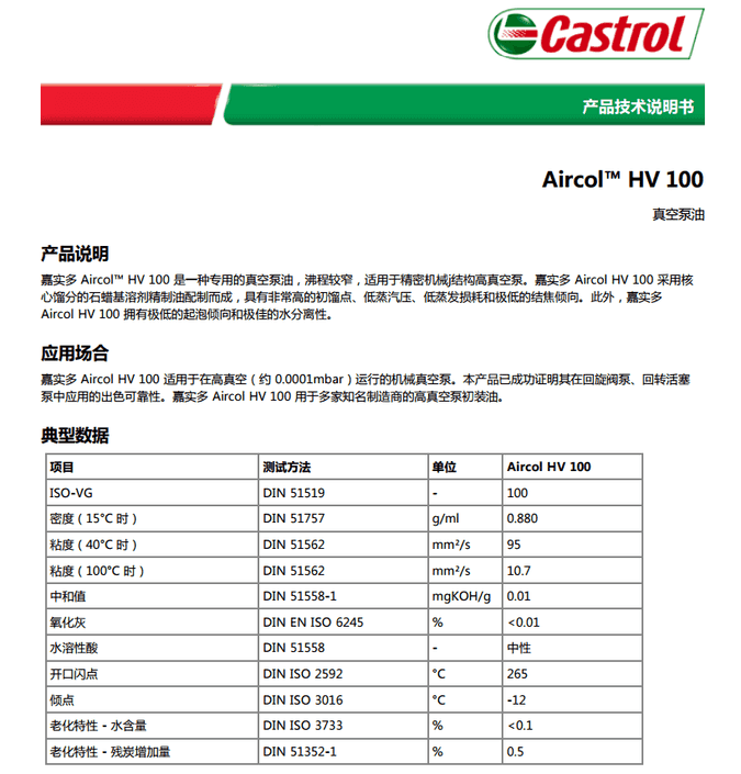 嘉實多 Aircol  HV 100 是一種專用的真空泵油,沸程較窄,適用于精密機械j結構高真空泵。
