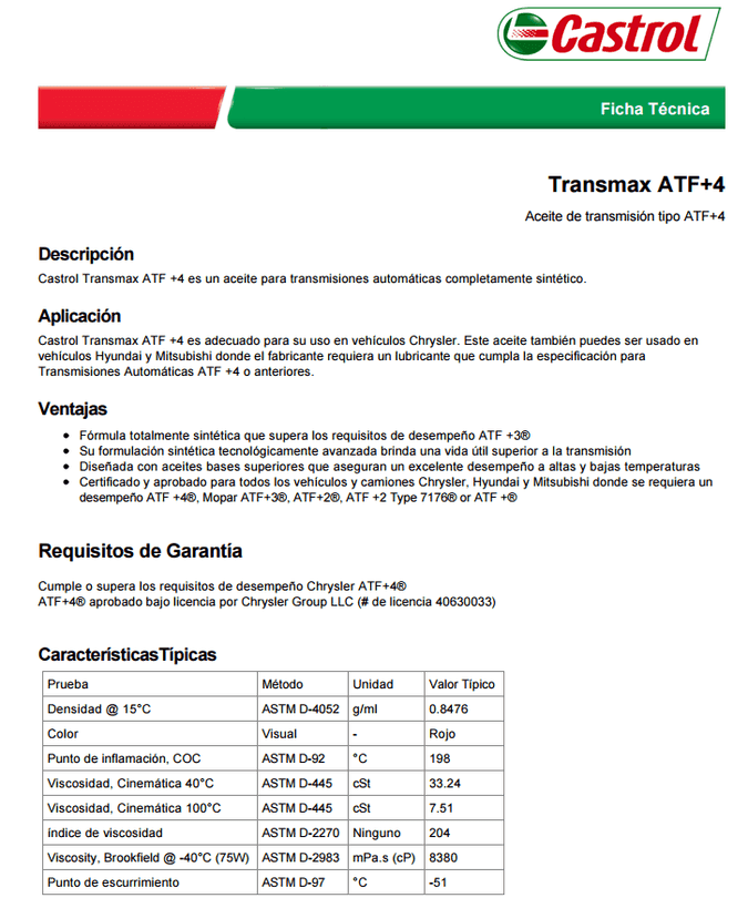 Castrol Transmax ATF +4批準許可證(許可證#克萊斯勒集團有限責任公司40630033