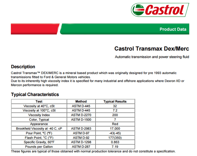 Castrol Transmax DEX/MERC是基于礦物產品最初被設計為自動預1993