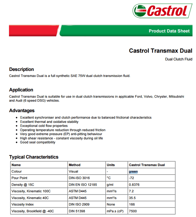 嘉實多美國雙是一個全合成SAE 75W的雙離合器傳動液。