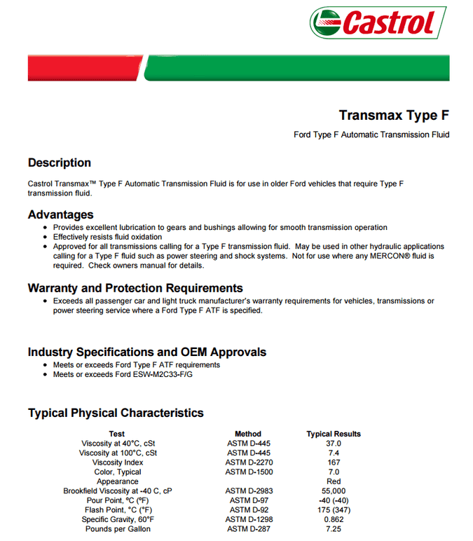 Castrol Transmax Type F自動變速器油是用于舊的福特汽車需要F型