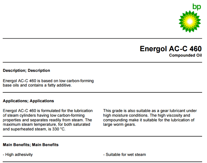 Energol AC-C 460是基于低碳形成基礎(chǔ)油和含有脂肪的添加劑。