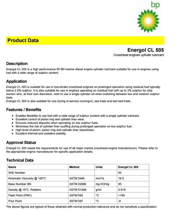 Energol CL 505滿足使用的所有主要的海洋十字頭式發動機制造商的要求。請參閱