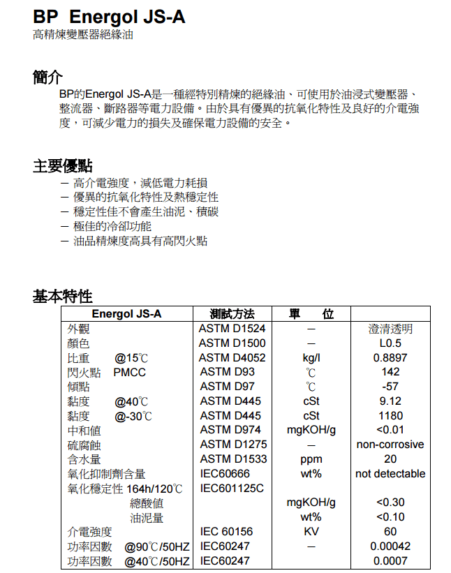 BP的Energol JS-A是一種經特別精煉的絕緣油、可使用于油浸式變壓器、
