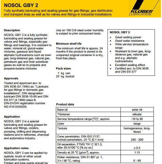 Nosol GBY 2是一種全合成的配件尤其是燃?xì)忾y門和軸承的潤滑和密封油脂。 抗水,油,乙二醇 - 水的混合物和脂族氣態(tài)和液態(tài)烴,如城市和邊遠(yuǎn)氣體,如自然氣體和石油氣體天然氣,以及交換的氣體,丙烷,丙烷 - 丁烷混合物。