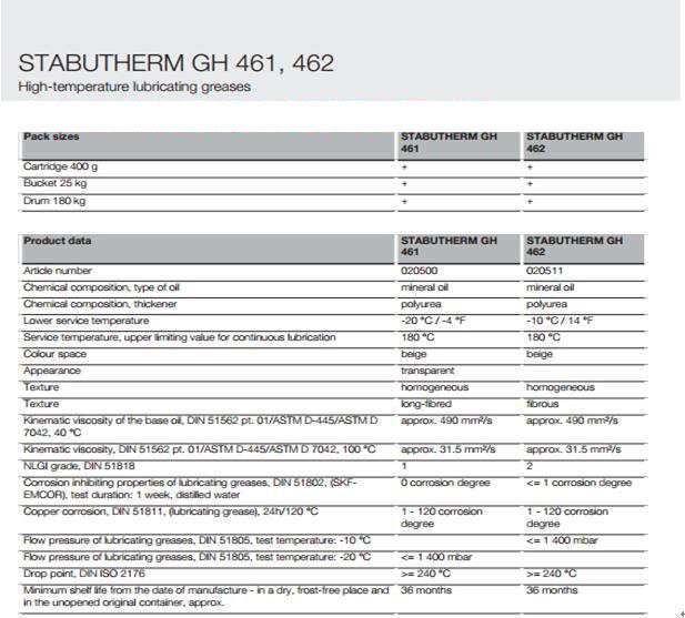 STABUTHERM GH 461、 STABUTHERM GH 462高溫油脂,礦物油/聚脲的基礎上。 他們有一個很寬的溫度范圍內,并且在輥(軸承)的工作溫度為180℃下可以使用。