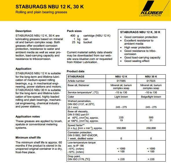 STABURAGS NBU 12 K,30 K滾動軸承和滑動軸承潤滑脂基于礦物油和鋇的復合物。 在這兩種脂肪的很好的抗腐蝕保護是至關重要的。 此外有STABURAGS NBU 12 K和30 K的一個非常好的水和耐化學性,和設計方面磨損和承載屬性。 他們還對微動腐蝕有很好的效果。
