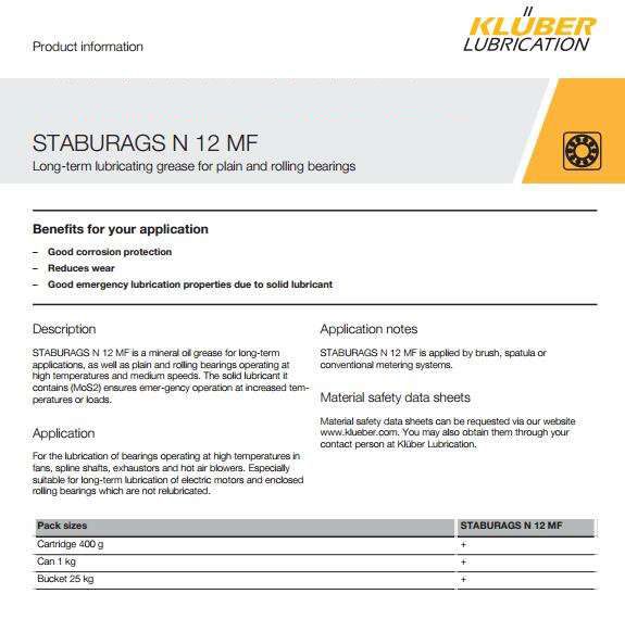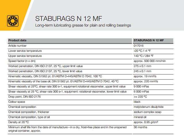 STABURAGS N 12 MF是一種礦物質,長期,滑動軸承,軸承潤滑脂,適用于高溫和中等速度。