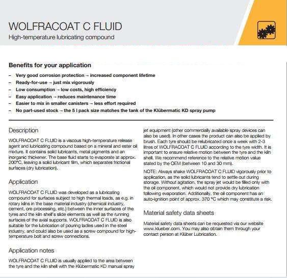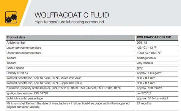 WOLFRACOAT C流體是厚的高溫釋放劑和潤滑劑的化合物根據在。 它包含固體潤滑劑和各種金屬顏料和無機增厚。 基礎液體在約200℃下蒸發,留下的固體潤滑劑,均勻的膜的摩擦表面分離(干式潤滑)。