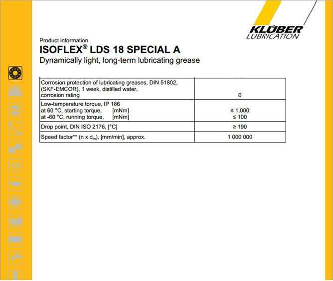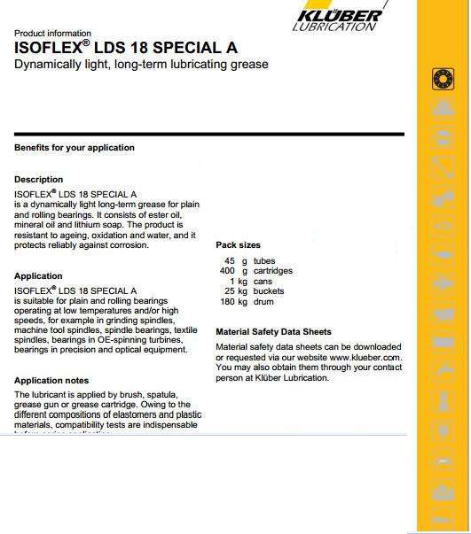KLUBER ISOFLEX LDS 18 SPECIAL A低噪音高速軸承脂德國 KLUBER ISOFLEX LDS 18 SPECIAL A潤滑脂是一種輕載長壽低噪音高速軸承脂。應用特性:PCB線路板鉆孔機絲桿導軌用油脂,紡織機械高速主軸用油脂。超高速CNC、磨床主軸、高速木工機械指定用潤滑脂。主要由礦物油、酯類油、鋰皂組成,適用于高速低溫輕載荷滾動軸承及滑動軸承的潤滑,