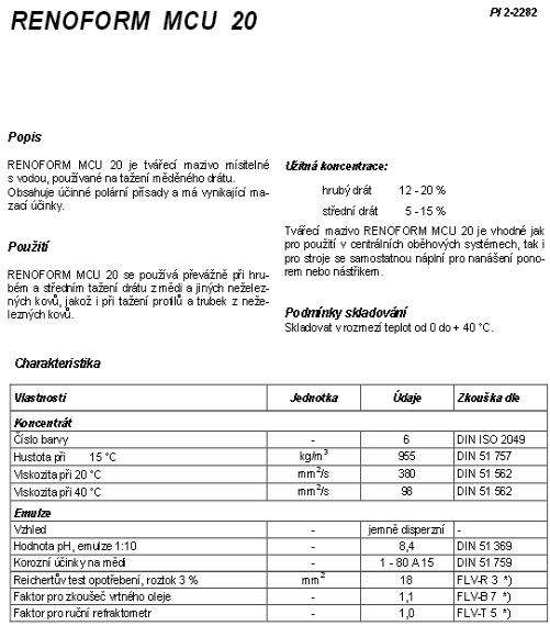 RENOFORM MCU 20 銅、其它有色金屬水溶性乳化液.極佳的潤滑和穩定性能.使用壽命長,不含氯、硫、苯酚及亞鹽等。用于粗/中粗銅絲的拉絲及有色金屬的型材、管材的拉拔、沖壓成。