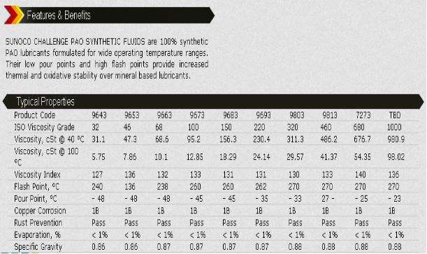 SUNOCO CHALLENGE PAO SYNTHETIC FLUIDS 100%合成PAO潤滑油配方的寬工作溫度范圍。他們的低倒點和高閃光點提供增加礦物基潤滑油的熱穩定性和氧化穩定性。