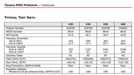 CALTEX PMO Premium造紙機循環油系統尤其是有超細過濾器的系統及采用過熱蒸汽作業與易受水污染的場合?吸水箱泵、真空泵、白水泵、攪拌器、減速齒輪裝置及齒輪減速電動機??紙漿碾磨機和紙漿精磨機的潤滑油循環系統?一般工業用齒輪傳動裝置與泵?在高達80度的環境高溫下工作的普通及抗磨軸承性能標準 達到或超過所有紙漿與造紙工業之潤滑劑規范標準。