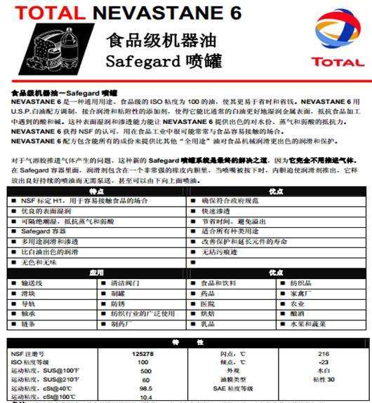 NEVASTANE 6配方包含能所有的成份來提供比其他“全用途”油對食品機械潤滑更出色的潤滑和保護。對于氣溶膠推進氣體產生的問題,這種新的Safegard噴罐系統是最終的解決之道,因為它完全不用推進氣體。在Safegard 容器里面,潤滑劑包含在一個非常強的橡皮內膽里,當噴嘴被按下時,內膽迫使潤滑劑推出,它釋放出良好持續的噴油而無需泵送,甚至可以由下向上面噴油。