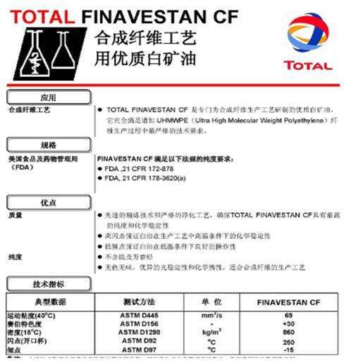 優勢 先進的精煉技術和嚴格的凈化工藝,確保TOTAL FINAVESTAN CF具有最高的純度和化學穩定性 高閃點保證白油在生產工藝中高溫條件下的化學穩定性 低傾點保證白油在低溫條件下良好的操作性 不含硫及芳香烴 無色無味,優異的光穩定性和化學惰性,適合合成纖維的生產工藝。