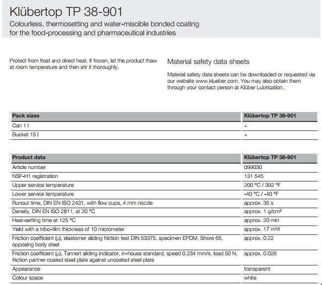 Klubertop TP 38-901,熱固化,單組分涂料用于食品,醫藥等行業。 KlubertopTP 38-901干膜符合以下要求: