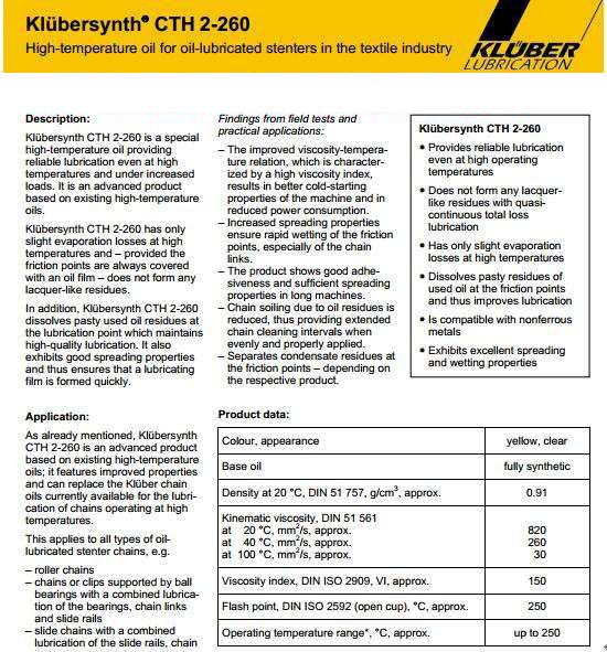 克魯勃CTH 2-260是一個特殊高溫油潤滑可靠,即使在高工作溫度和壓力。 以前克魯勃高溫油,這是合乎邏輯的發展。 克魯勃CTH 2-260僅具有低的蒸發損失在高溫和控制的應用程序的形式 - 要求的摩擦點總是潮濕油 - 沒有清漆狀的殘余物。 此外,再生,克魯勃CTH2-260結構使用過的油的摩擦點,再次充分的潤滑。 此外,它的特點是特別從而使得為快速拍攝。