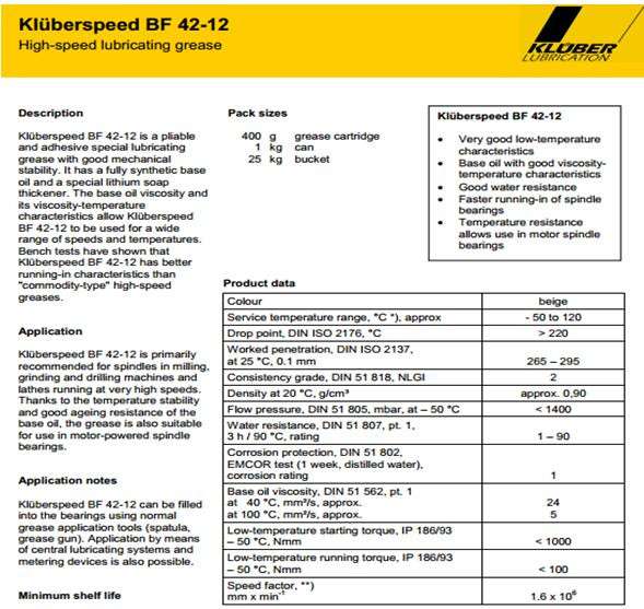Kluberspeed BF 42-12是一種堅實,穩定的步行路程特殊潤滑脂,全合成基礎油和鋰皂為稠化劑。 選定的基油粘度的基油的粘度 - 溫度特性,將確保廣泛的速度和溫度范圍內的Kluberspeed BF 42-12。測功機試驗表明,Kluberspeed BF 42-12標準的高速潤滑脂相比,具有更好的運行行為。